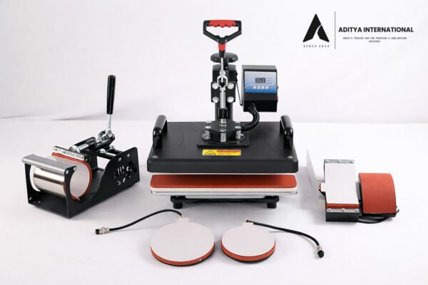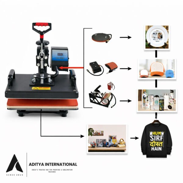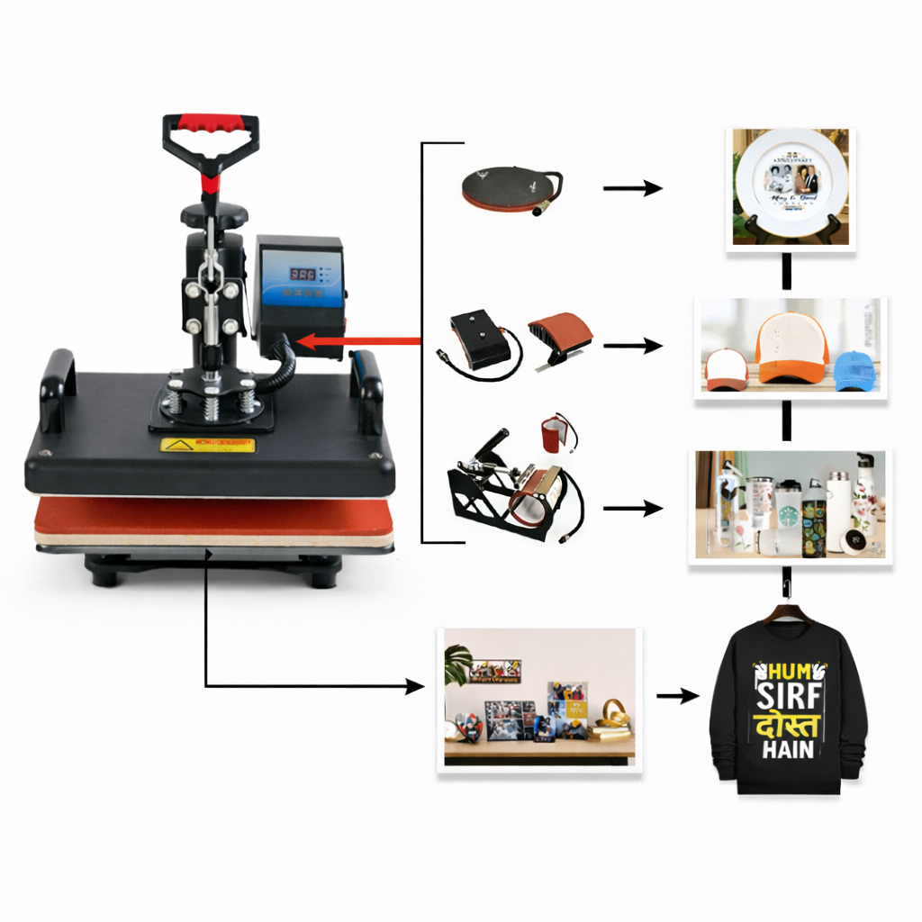 - This machine comes with attachments for T-shirts, caps, mugs, and both small and big plates, allowing users to create multiple customized products using a single machine.
